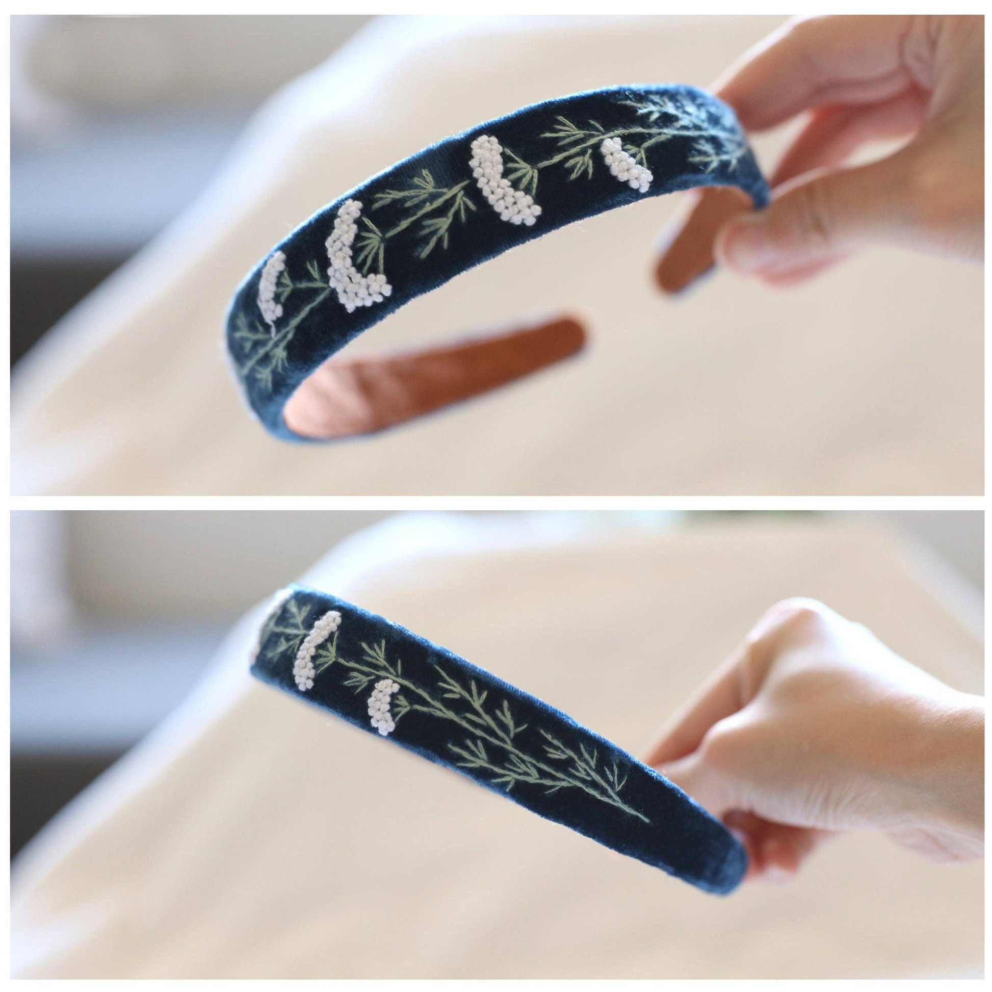 Cerchietto per Capelli in Velluto Ricamato con Motivo Floreale | Blu