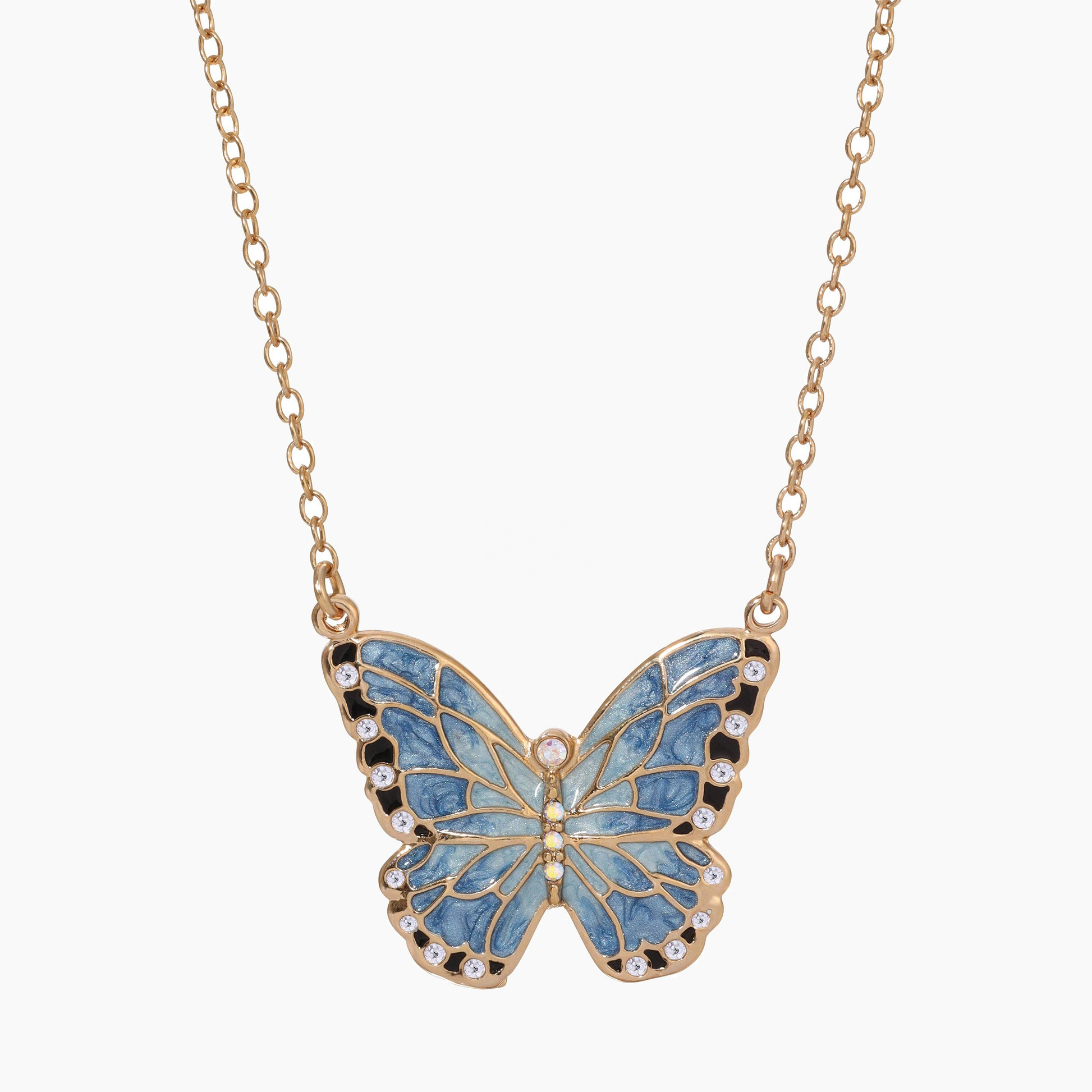Collana con pendente a farfalla luminosa ed elegante, perfetta per aggiungere un tocco raffinato anche agli outfit quotidiani. Le ali in smalto blu e nero sono impreziosite da cristalli rotondi trasparenti e cristalli AB dai riflessi iridescenti, che catturano la luce creando delicati giochi di colore. La catena e la struttura sono immerse in oro 14 carati per un effetto brillante e sofisticato.