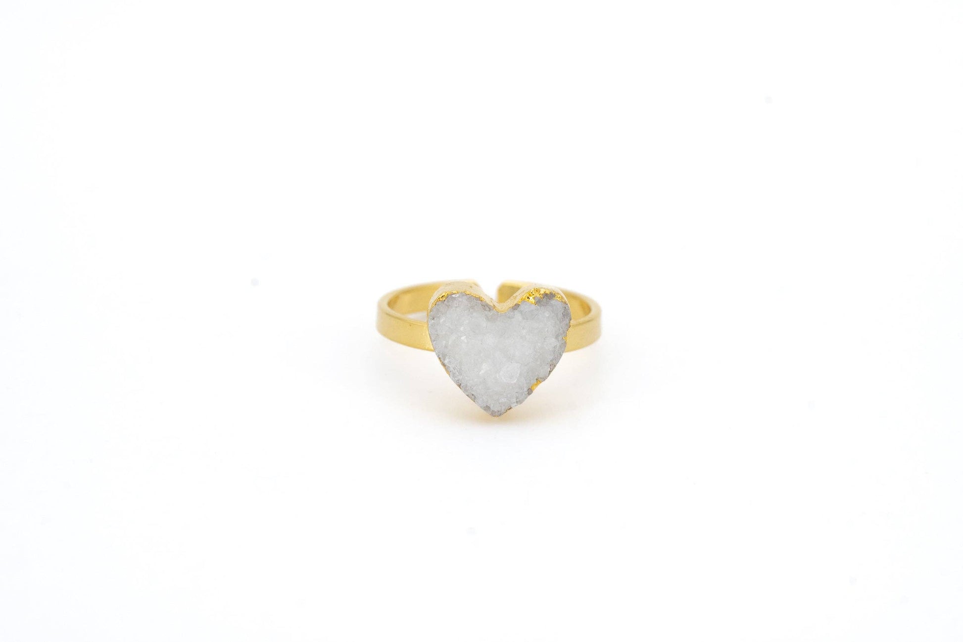 Elegante e delicato, questo anello in ottone con finitura in oro è impreziosito da una pietra di agata bianca. L’elastico interno nascosto lo rende regolabile dalla taglia 15 alla 19, garantendo comfort e vestibilità perfetta.