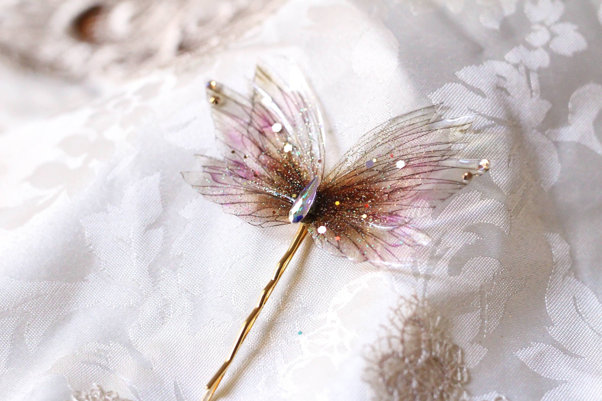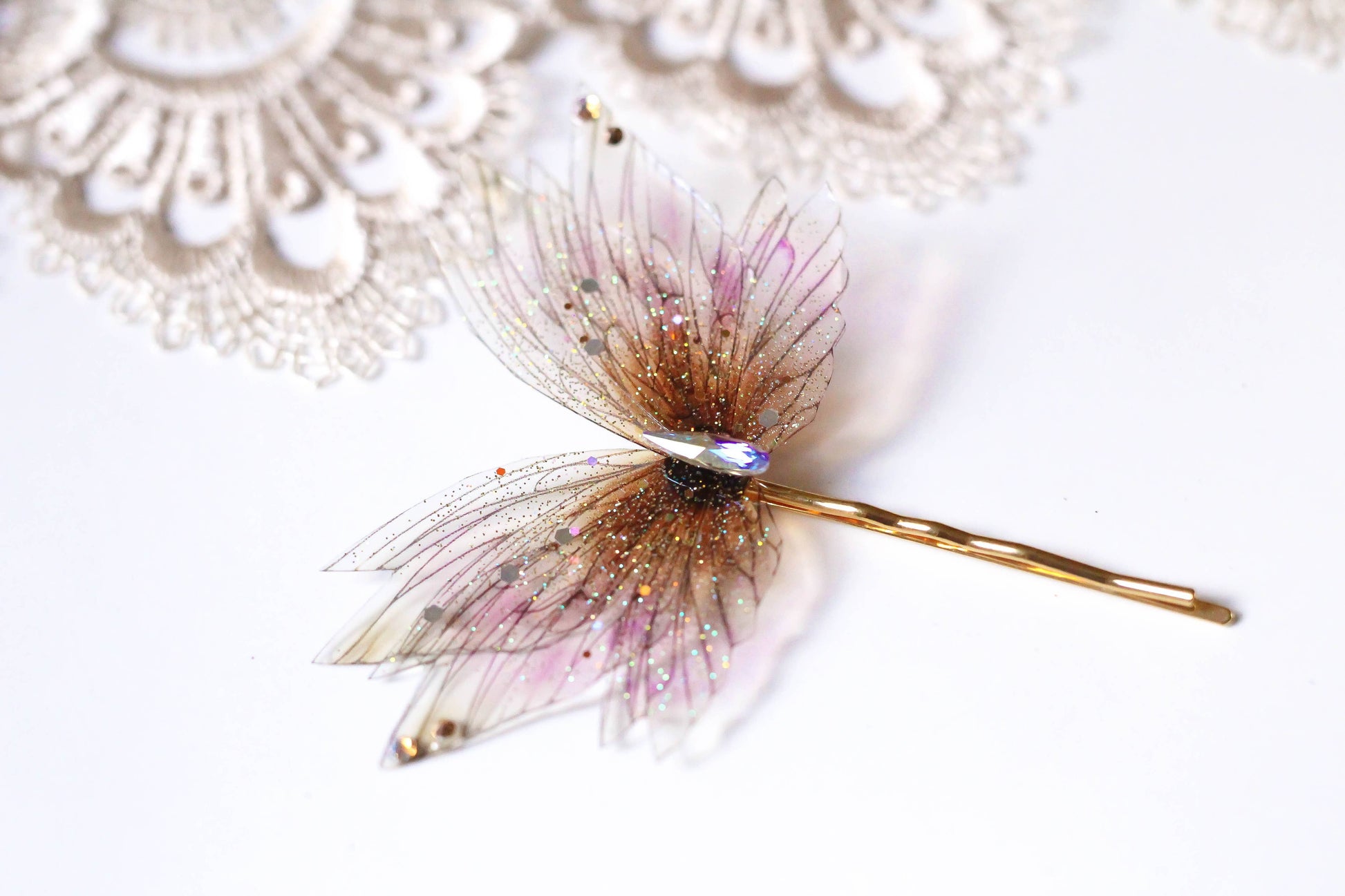 Magica forcina per capelli composta da sei ali di ninfa con un delicato dégradé caramello e viola orchidea, impreziosite da scintillanti glitter iridescenti. Il gioiello è ornato da una navette Swarovski centrale e da piccoli strass applicati sulle punte delle ali.