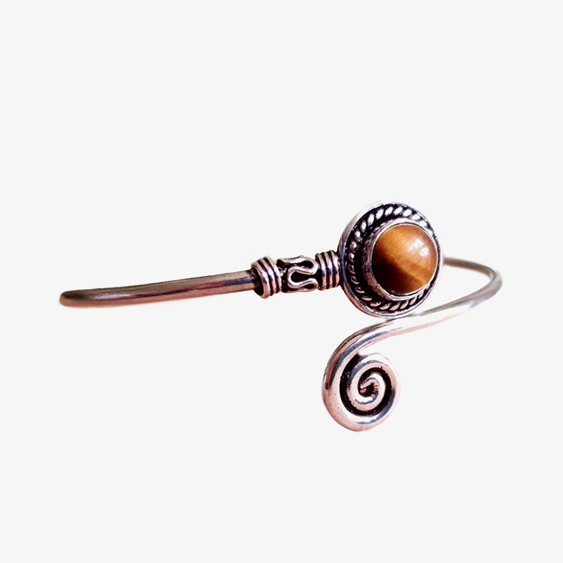 Bracciale a spirale placcato in argento con pietra di occhio di tigre, simbolo di forza interiore e protezione. Le sue sfumature dorate e brune riflettono la luce con intensità, evocando l’energia della terra e la magia degli amuleti antichi.