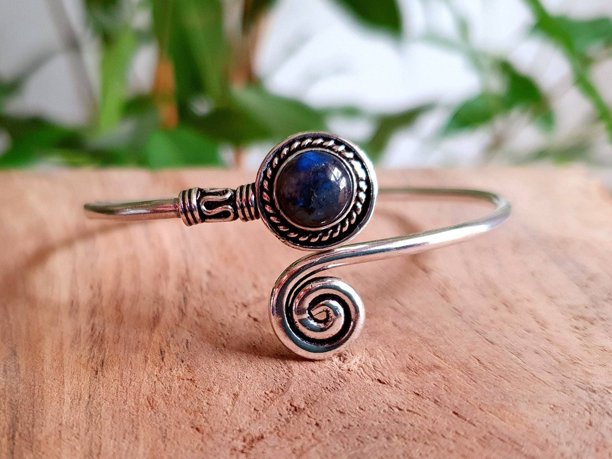 Elegante bracciale a spirale in argento placcato, impreziosito da una delicata pietra di luna blu, che cattura la luce con morbidi riflessi iridescenti.