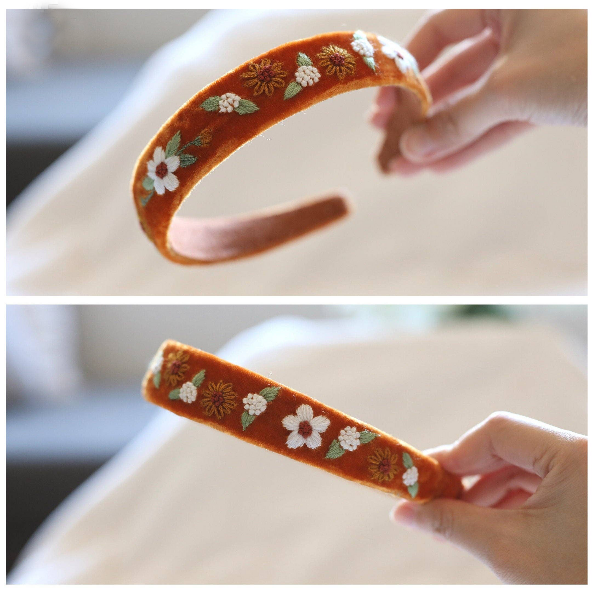 Cerchietto per Capelli in Velluto Ricamato con Motivo Floreale | Arancione