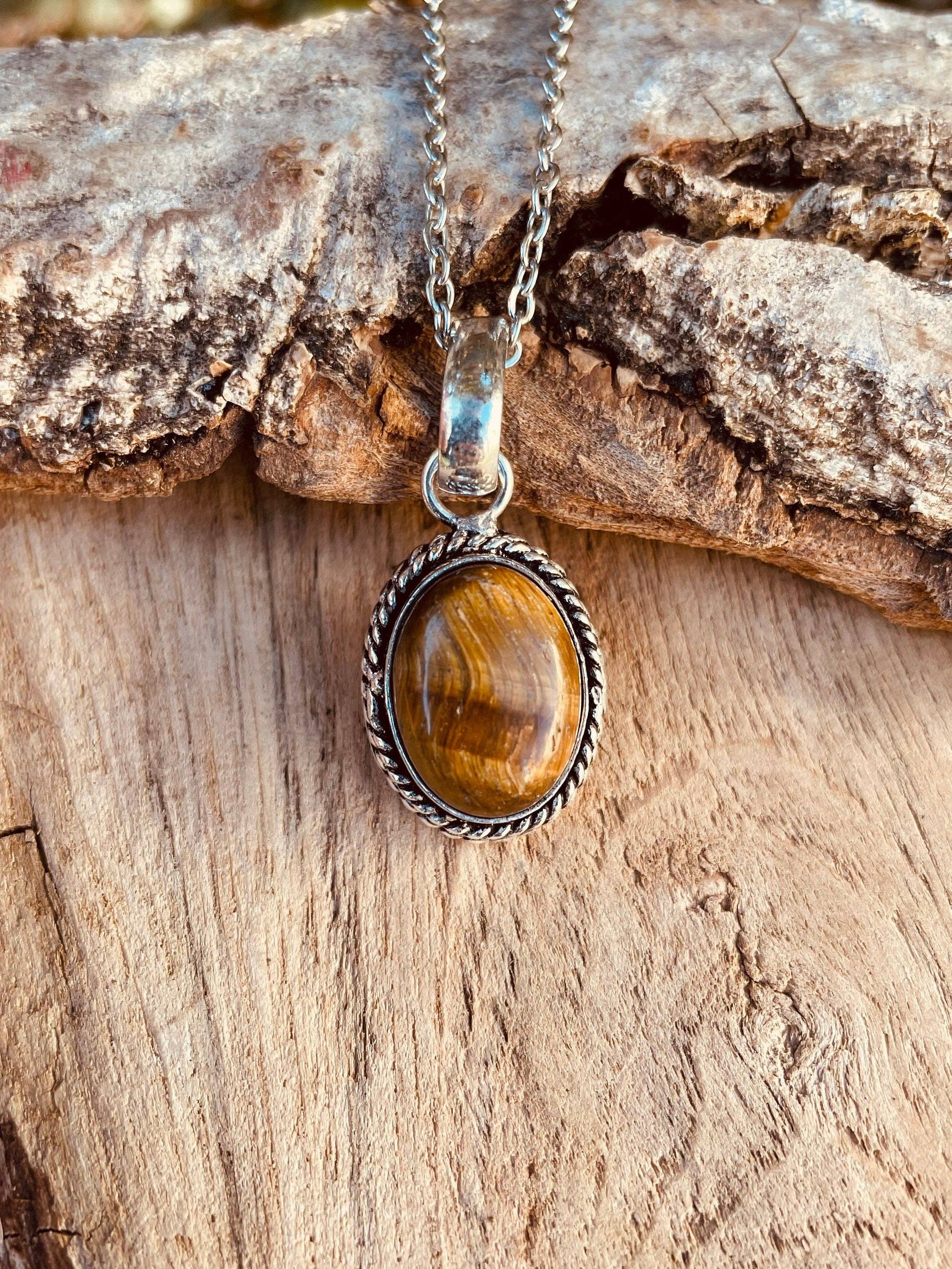 Ciondolo in Occhio di Tigre placcato argento con catena in acciaio inox