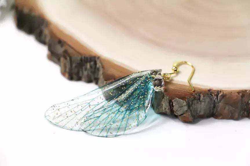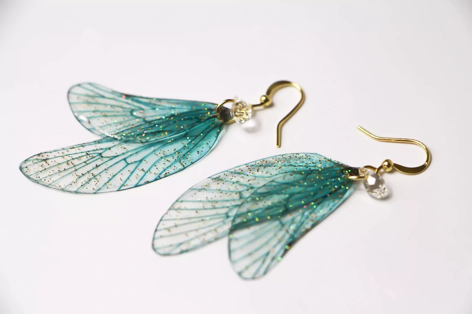Adorabile paio di orecchini composto da delicate ali di fata in blu turchese, impreziosite da una fine miscela di glitter iridescenti.