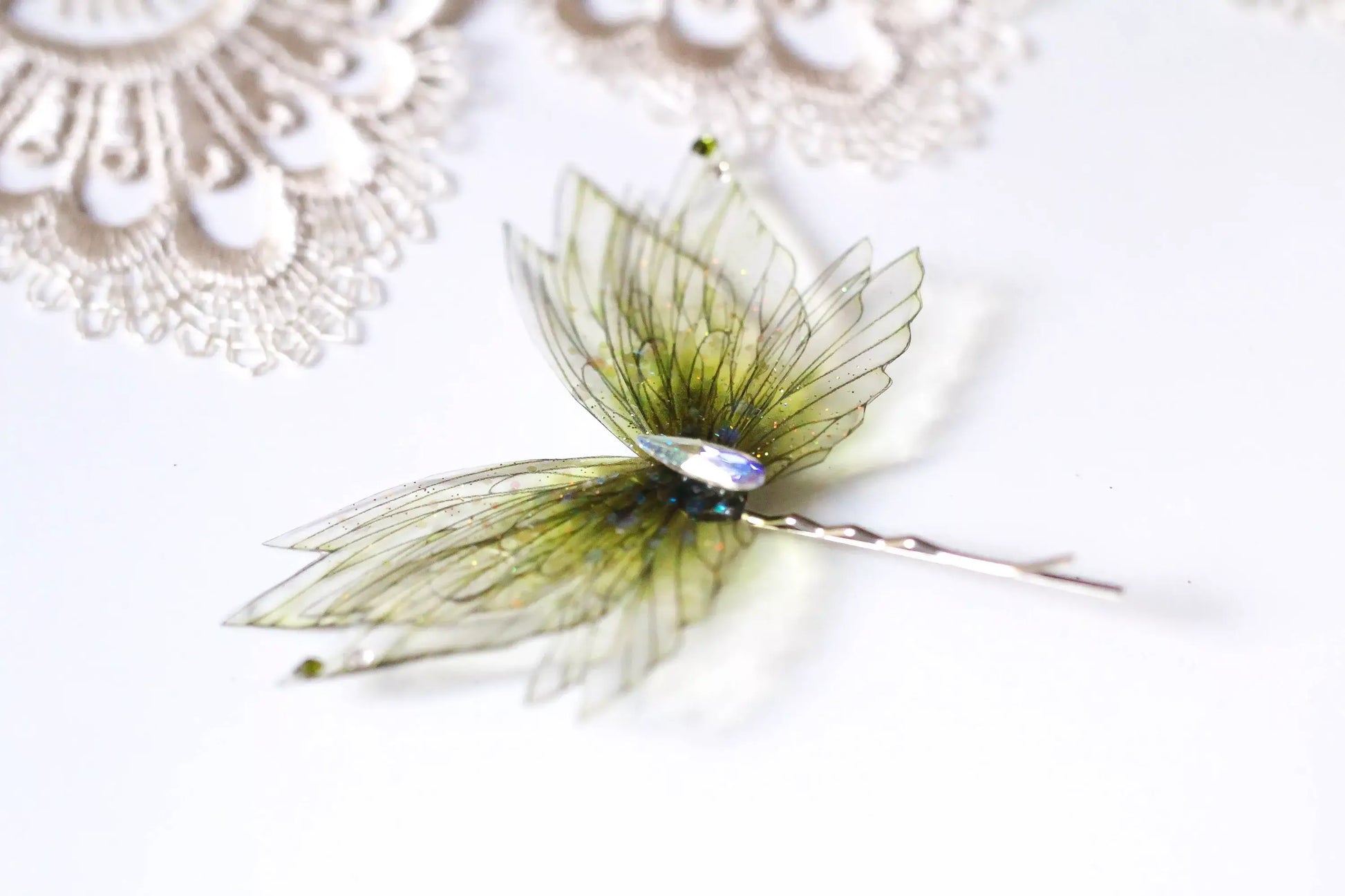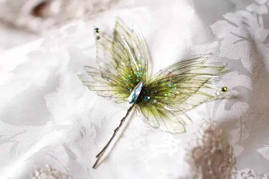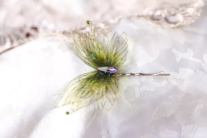 Magica forcina per capelli composta da sei ali di ninfa con un delicato dégradé verde tiglio, decorate da scintillanti paillettes iridescenti. Il gioiello è impreziosito da una navette Swarovski centrale e da piccoli strass applicati sulle punte delle ali.
