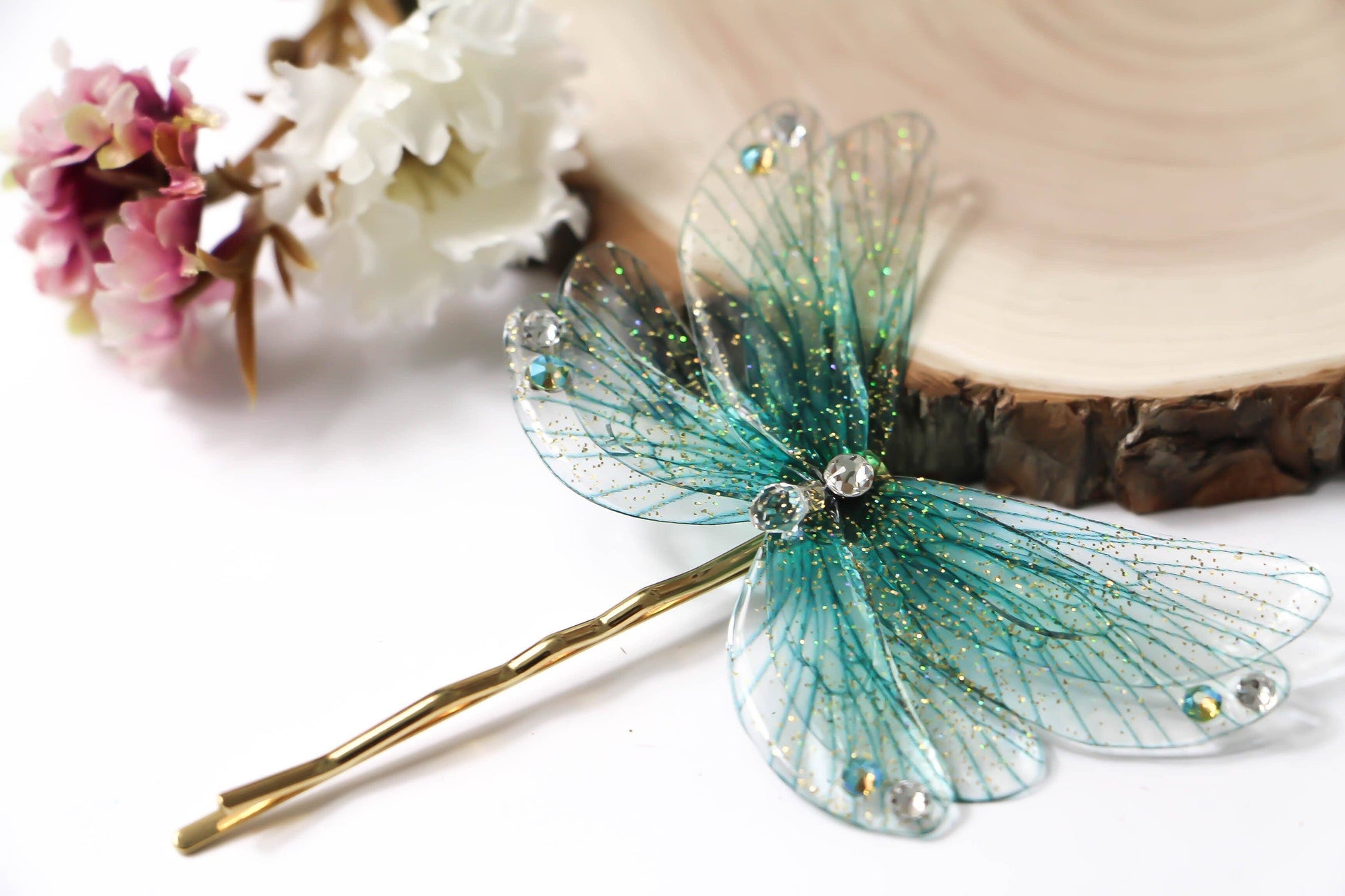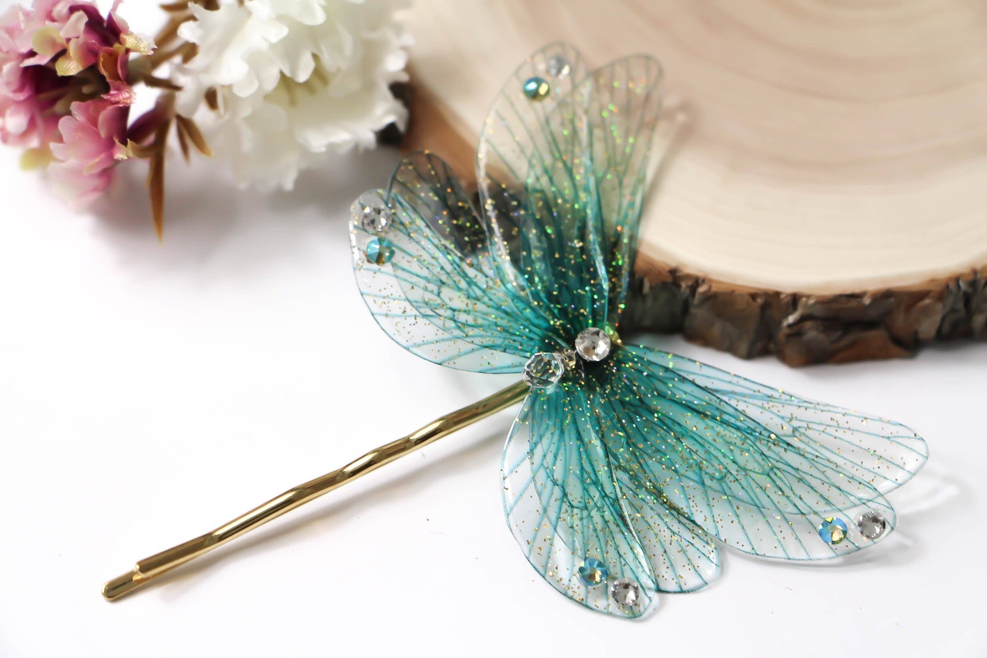 Forcina per capelli composto da otto ali di fata di colore blu turchese, cosparse da una leggera spolverata di glitter iridescenti. Il gioiello è impreziosito da un cristallo centrale trasparente e da piccoli strass Swarovski applicati sulle punte delle ali.
