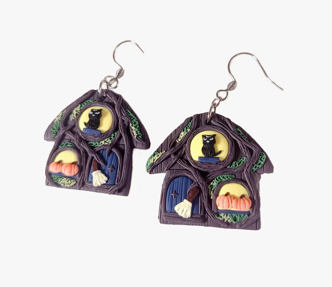 Trasforma il tuo stile con un tocco di magia spettrale! Questi orecchini a forma di casa stregata, realizzati a mano in argilla polimerica, sono il dettaglio perfetto per chi ama Halloween in modo originale e divertente. Piccoli gioielli artigianali che catturano lo spirito della stagione, tra mistero e divertimento.