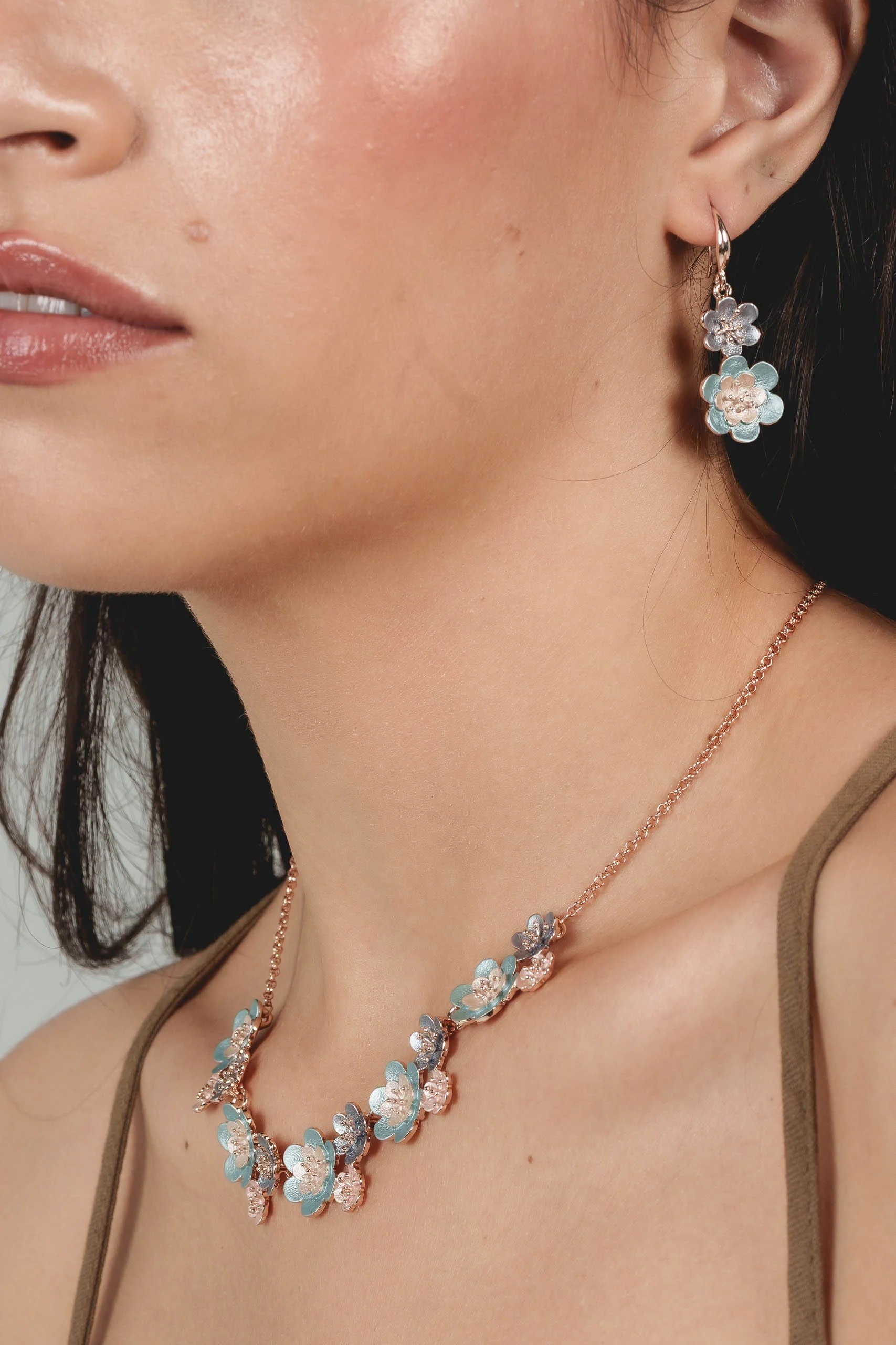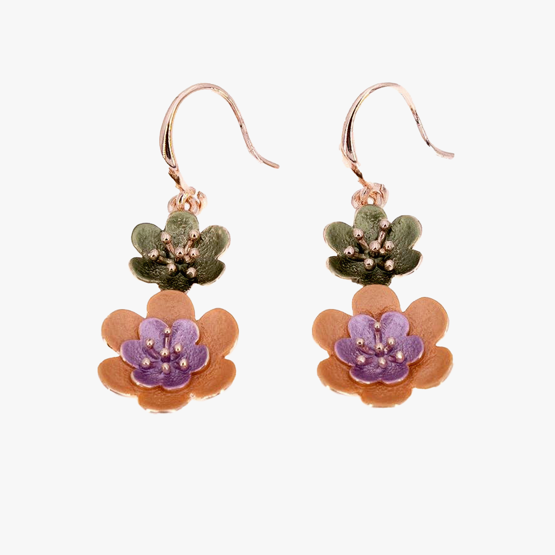 Delicati e romantici, questi orecchini pendenti sono decorati con fiorellini dipinti a mano su zama con finitura galvanica in oro rosa.