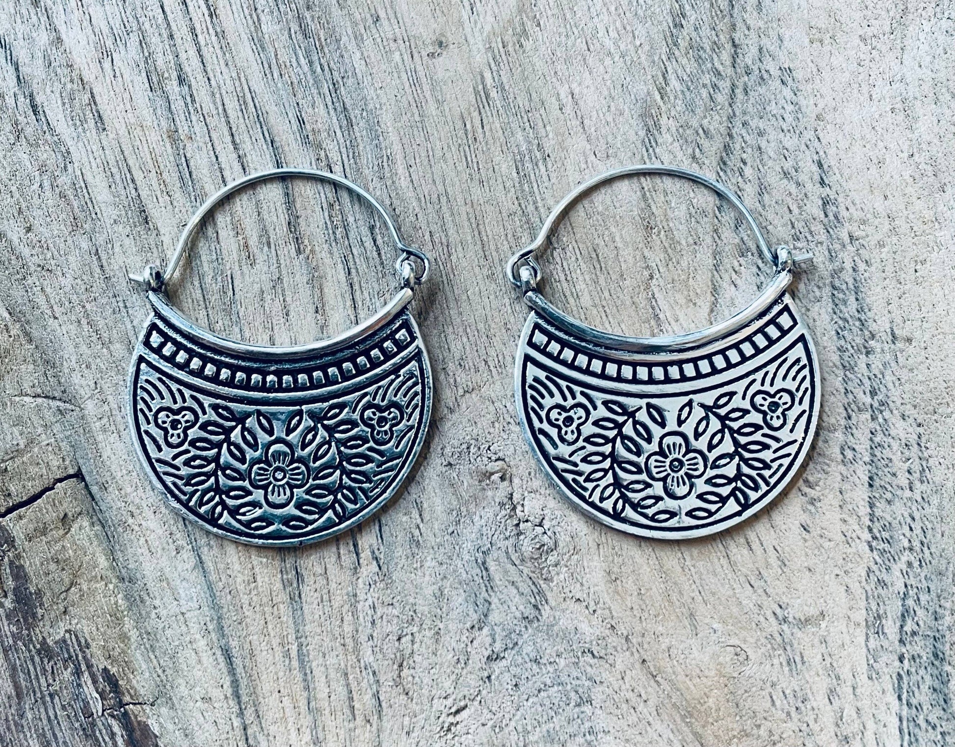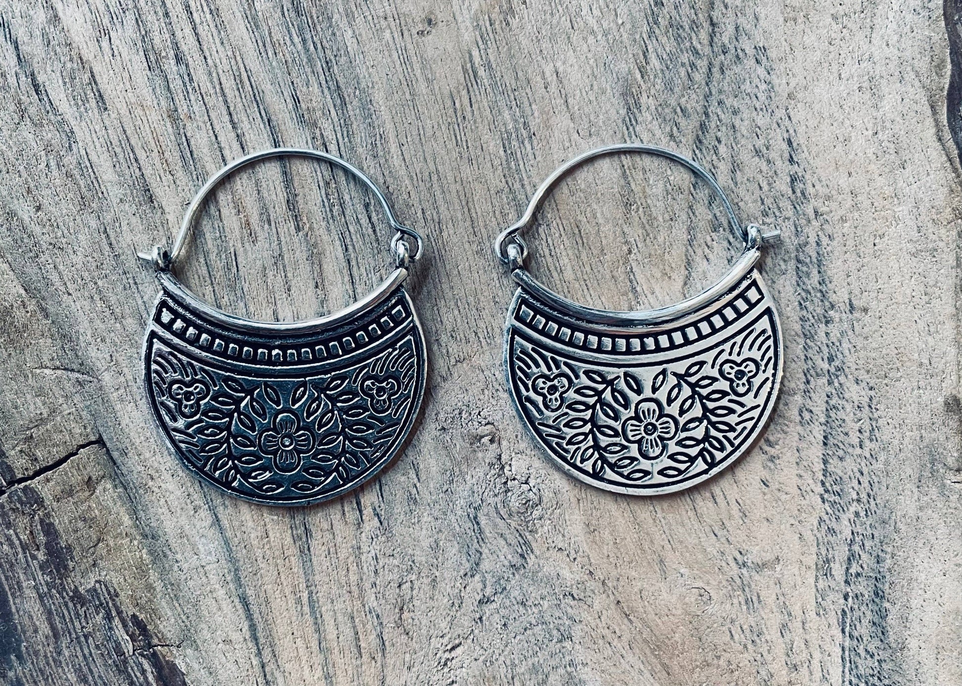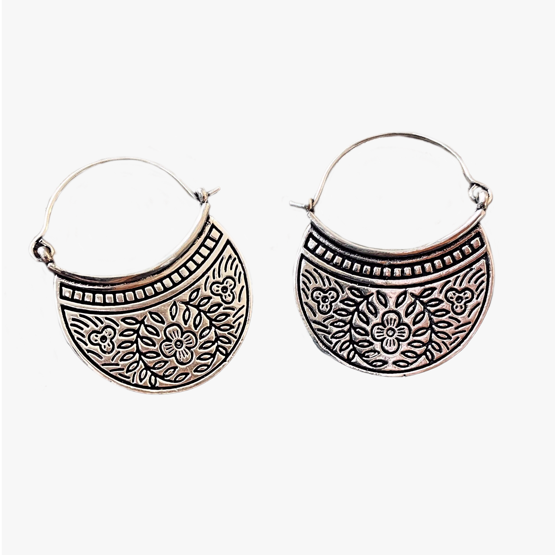 Deliziosi orecchini in argento placcato di alta qualità, arricchiti da raffinate incisioni floreali che ne esaltano i dettagli e lo stile artigianale.
