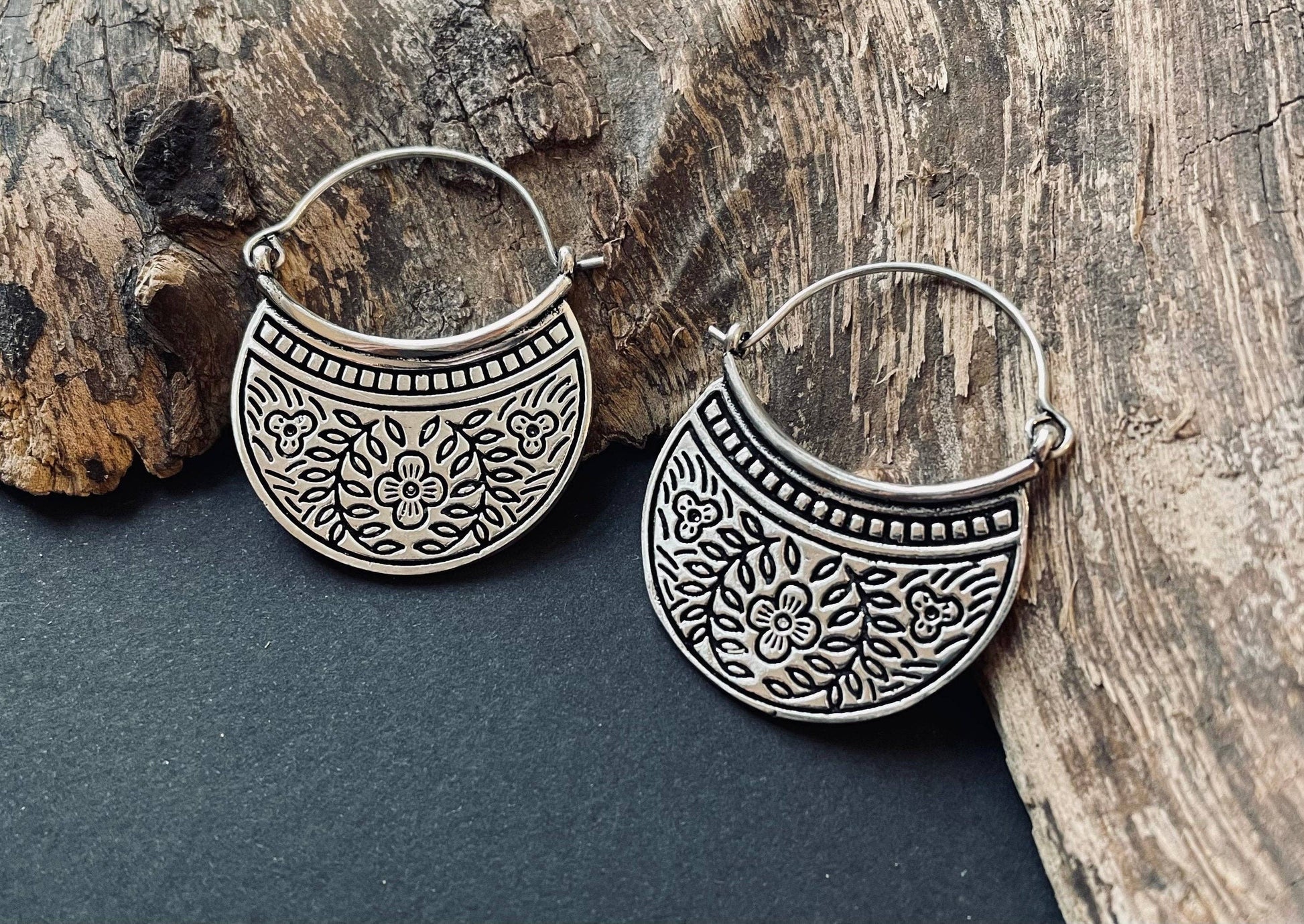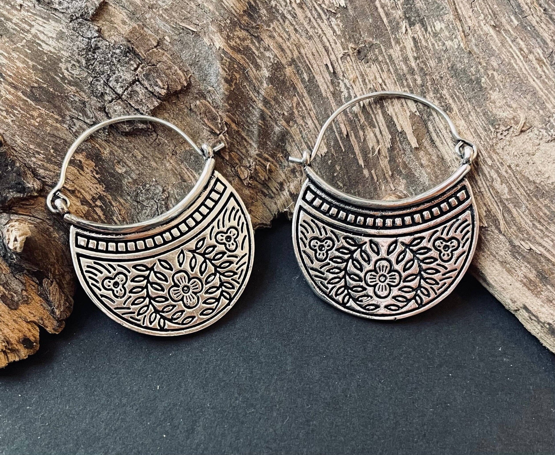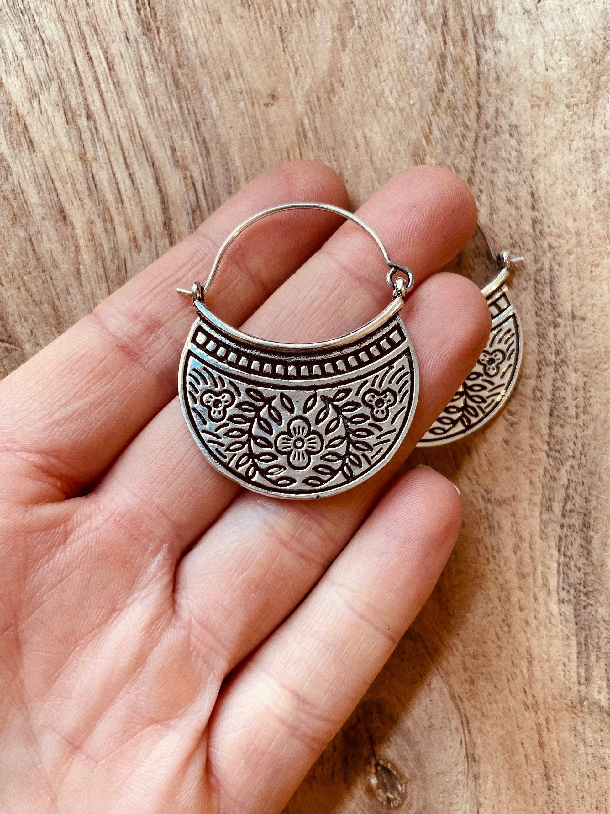 Deliziosi orecchini in argento placcato di alta qualità, arricchiti da raffinate incisioni floreali che ne esaltano i dettagli e lo stile artigianale.