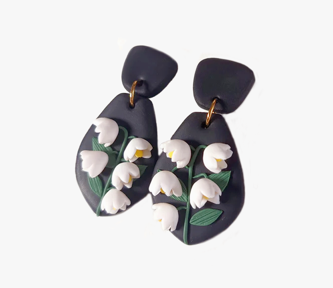 Questi orecchini floreali catturano la delicata bellezza del mughetto, reso ancora più bello dal contrasto con le basi nere. Un gioiello che non è solo accessorio, ma un piccolo simbolo di magia e mistero.