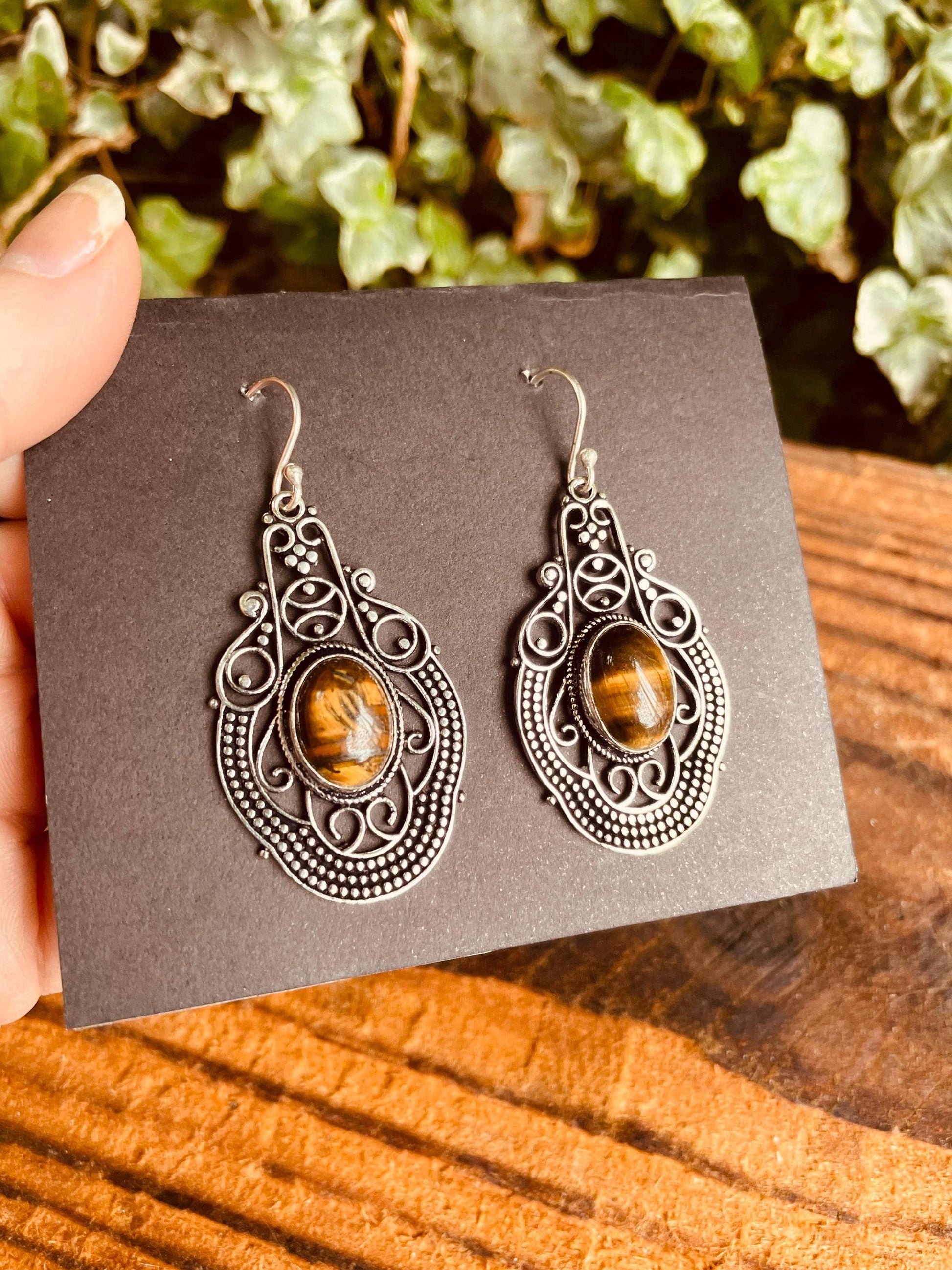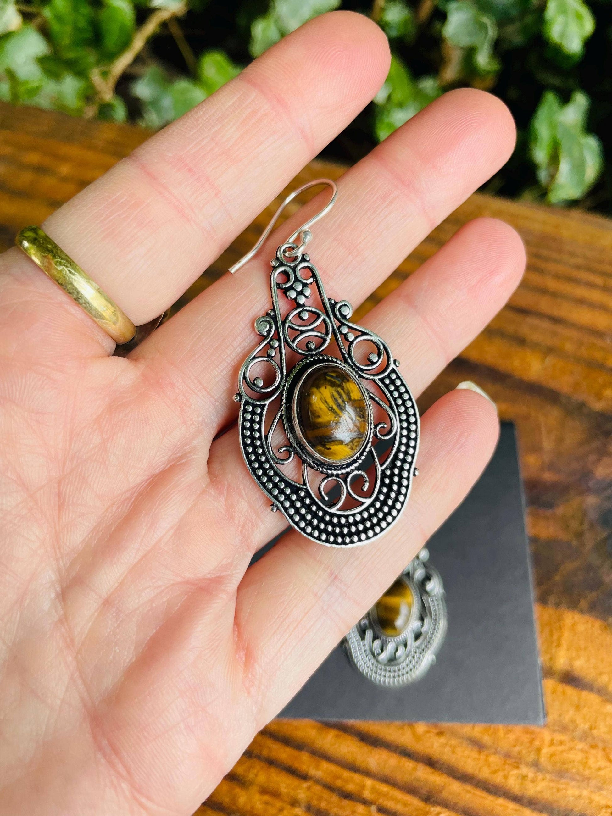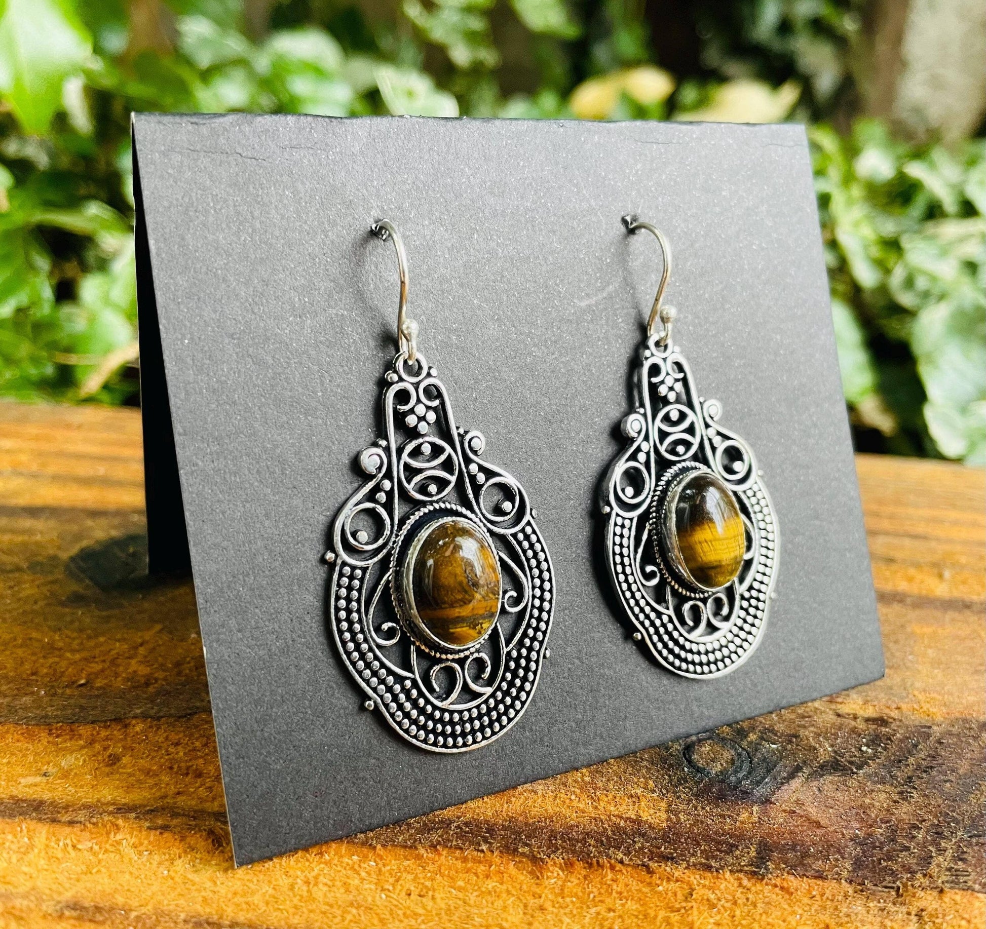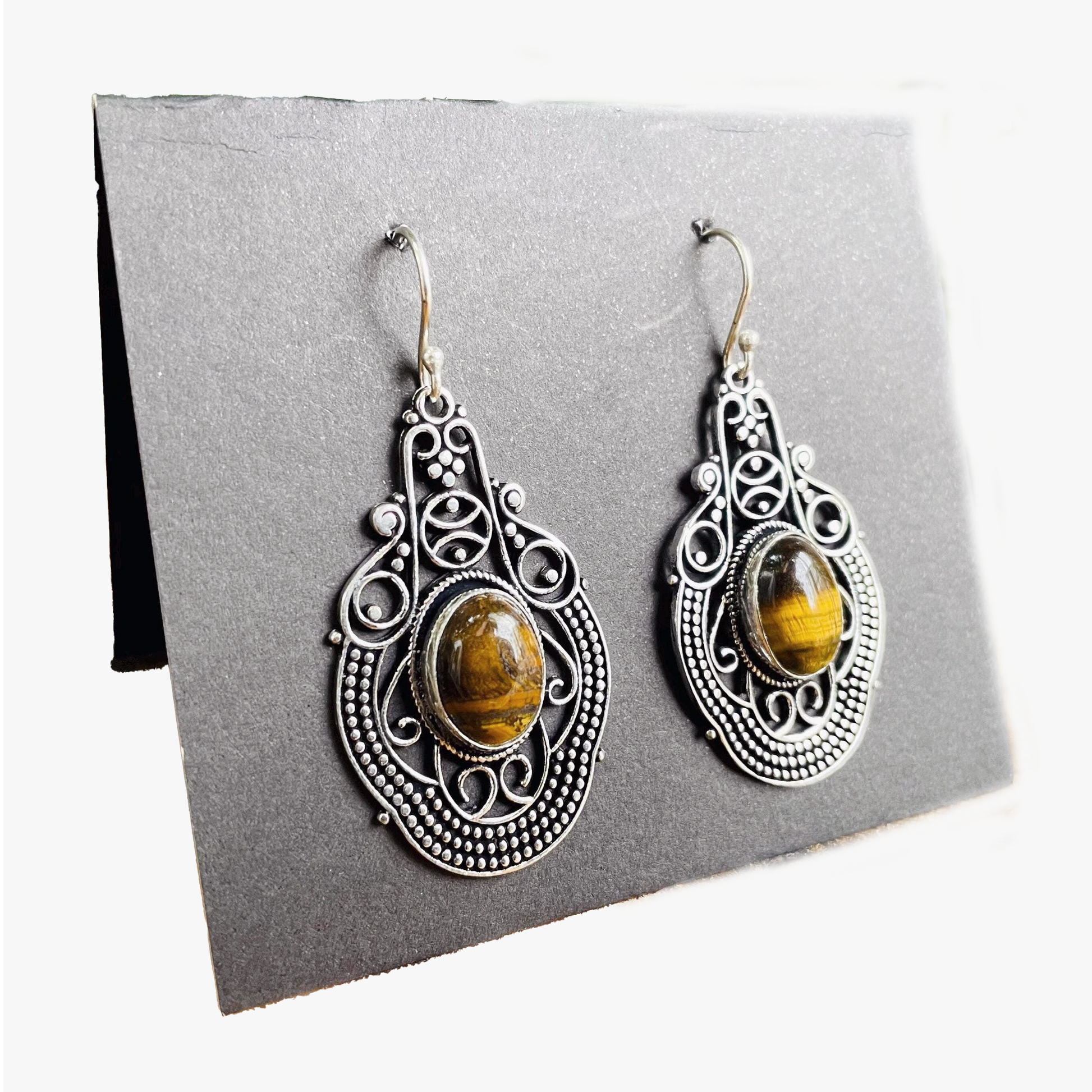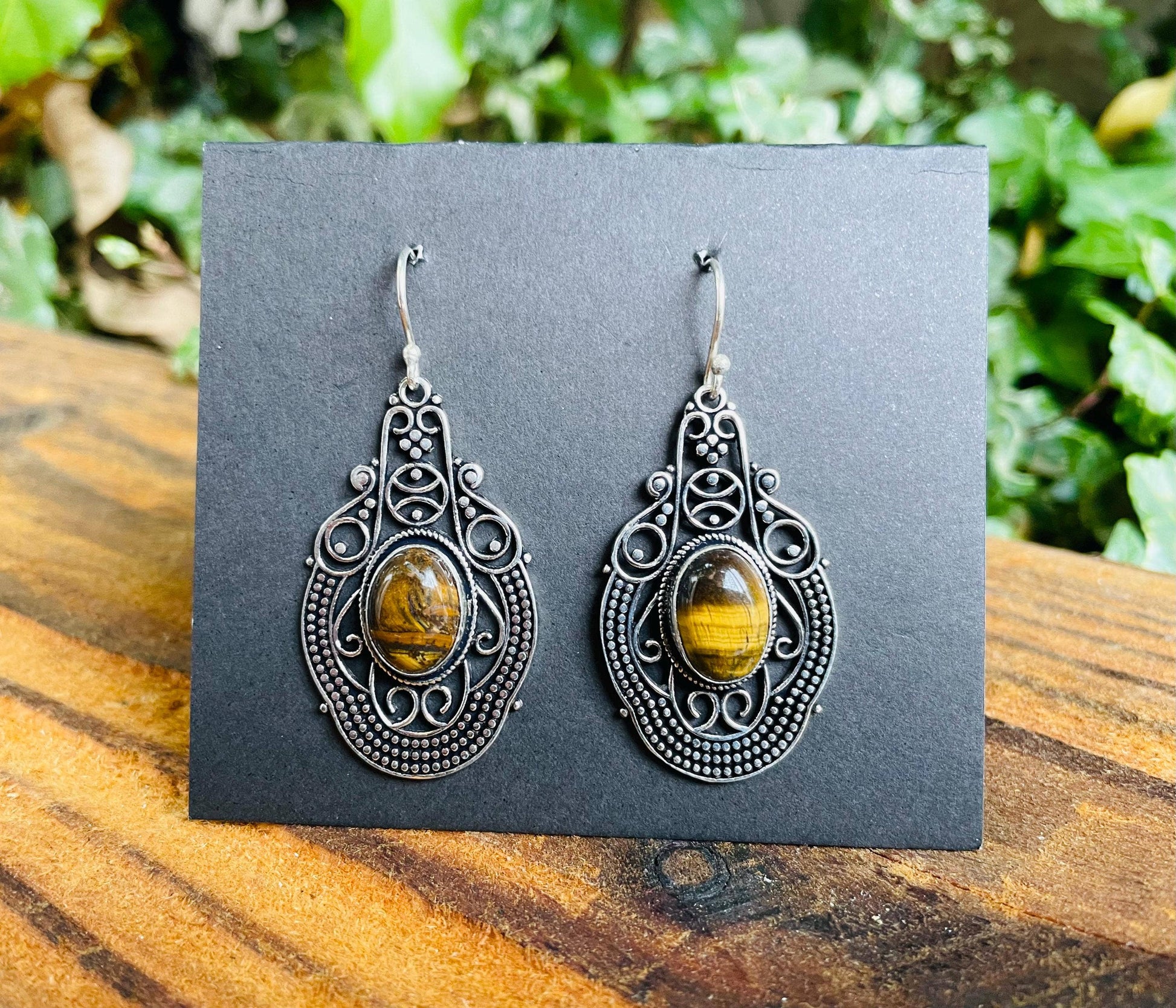 Imponenti e suggestivi, questi orecchini etnici in argento placcato sono impreziositi da pietre di Occhio di Tigre, che catturano la luce con calde sfumature dorate.