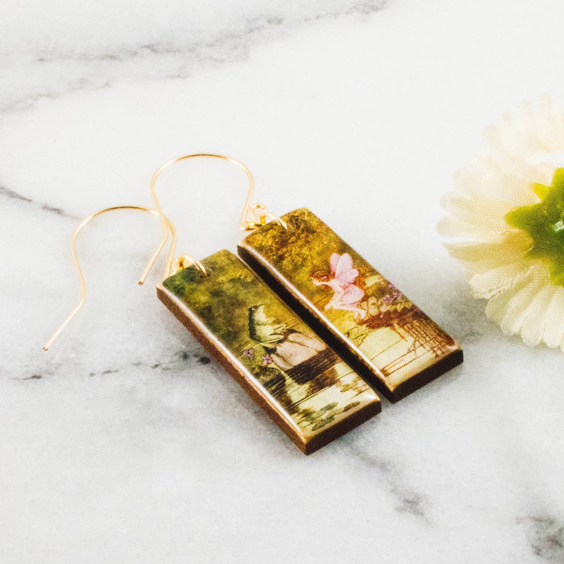 Questi fiabeschi orecchini illustrati raffigurano una rana e una piccola fata, un incontro magico tra natura e fantasia. Un design giocoso e incantevole, perfetto come regalo per chi ama il mondo naturale con un tocco fiabesco.