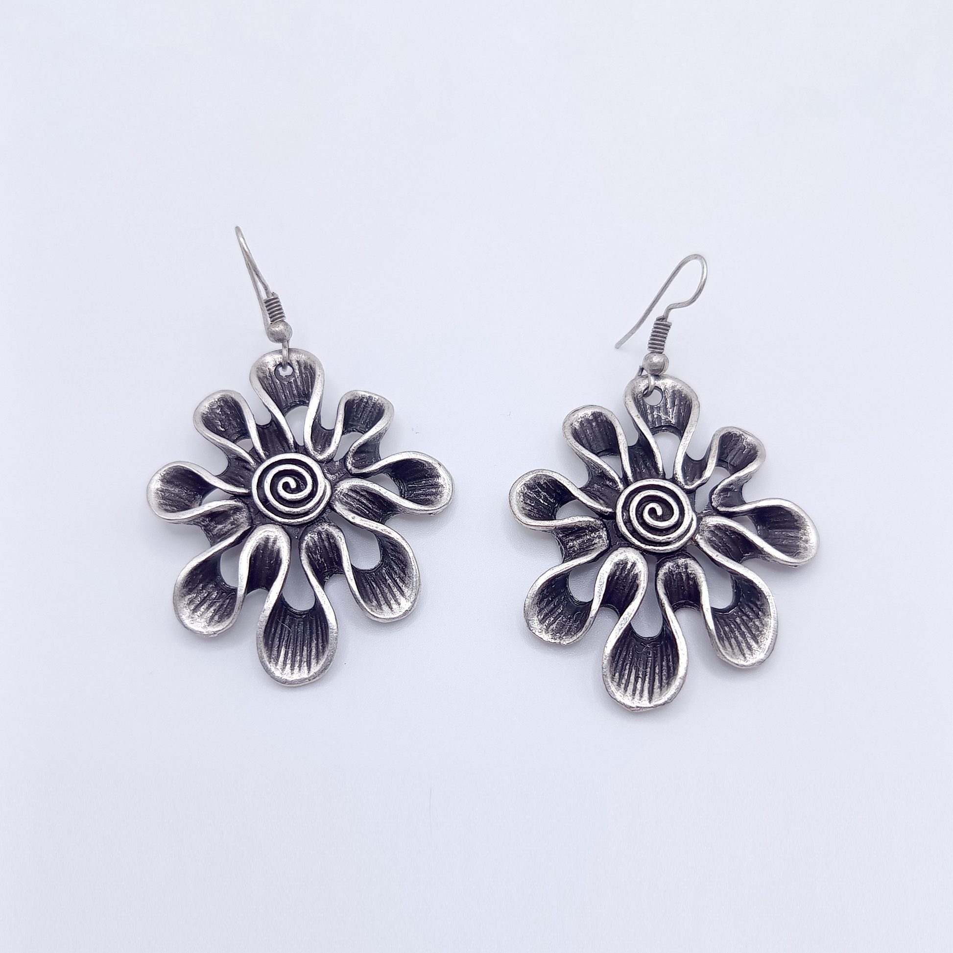 Il set “Mystic Blossoms” unisce eleganza fiabesca e carattere artigianale in un gioiello che sembra uscito da un giardino mistico. Composto da collana e orecchini coordinati, celebra il fascino dei fiori con una serie di petali sinuosi e irregolari, lavorati con un finish argento antico che dona profondità e una luminosità dolcemente sfumata.