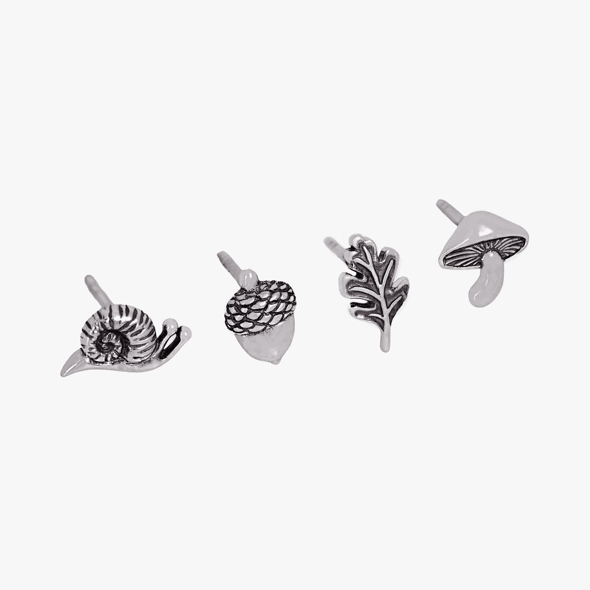 Il set unisce quattro delicati design ispirati alla natura: una lumaca, un fungo, una ghianda e una foglia di quercia, ognuno modellato con cura per evocare la quieta meraviglia del bosco in autunno.